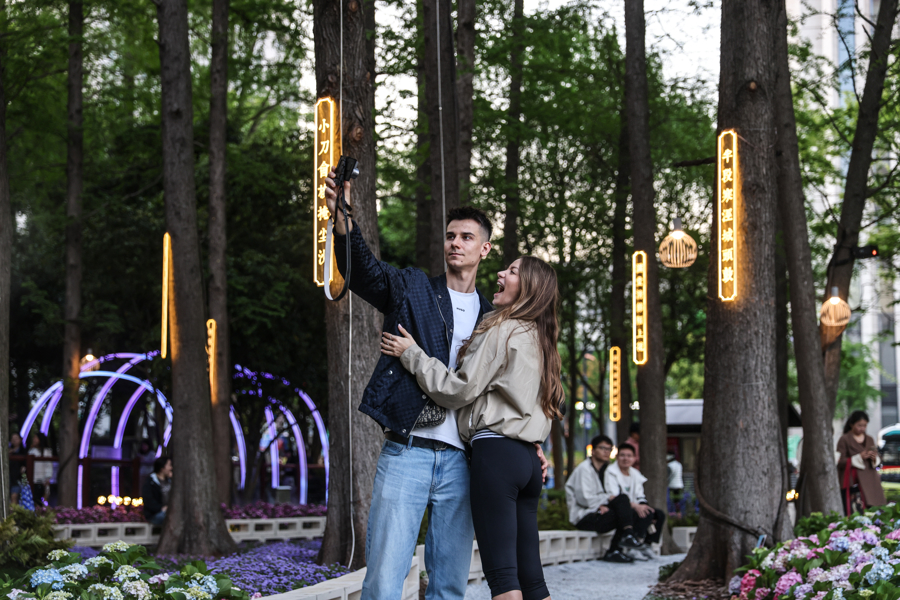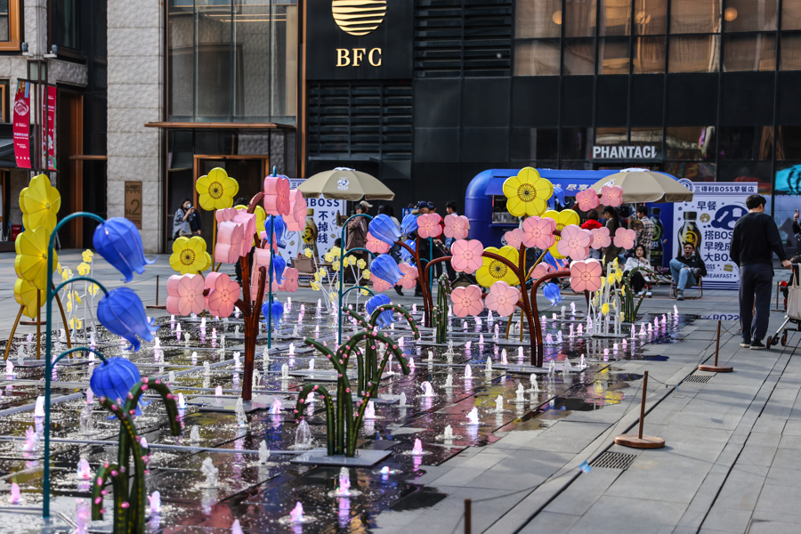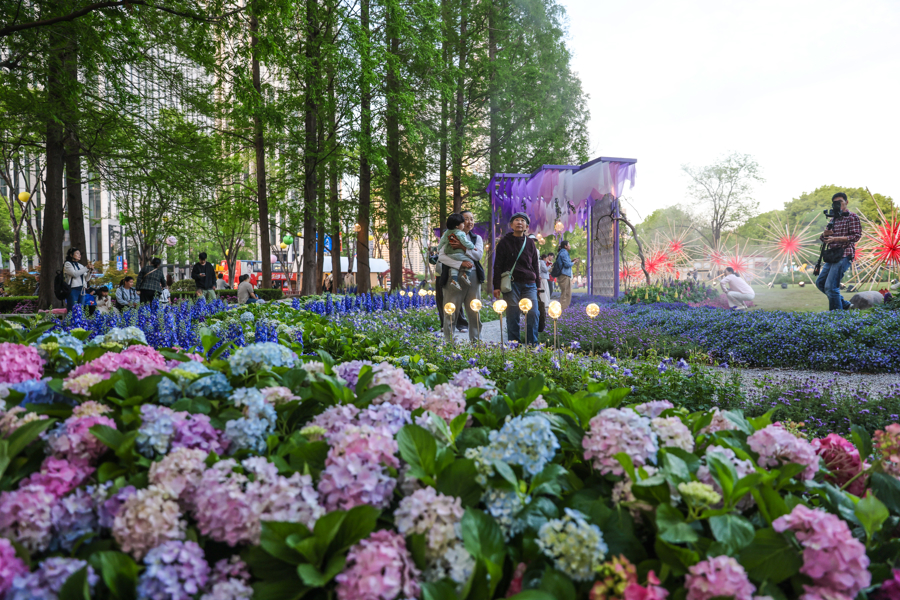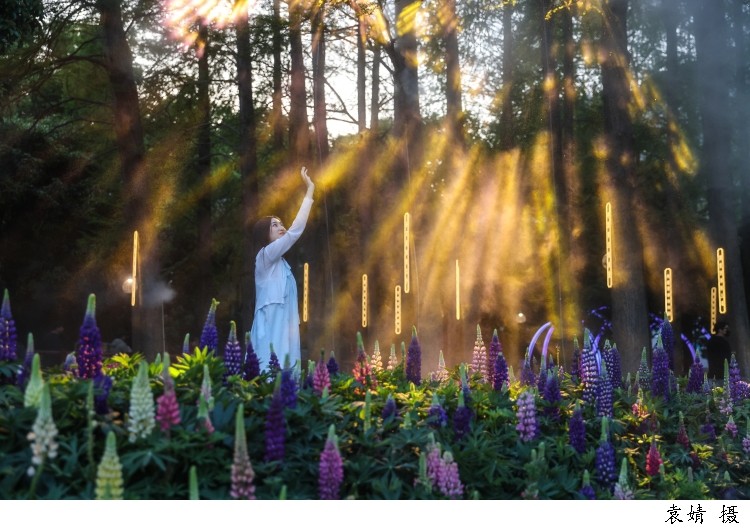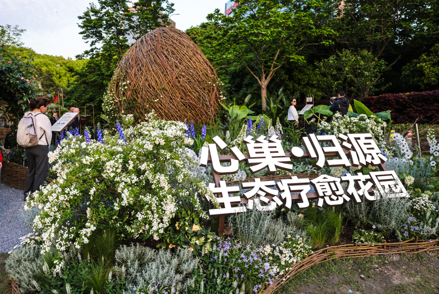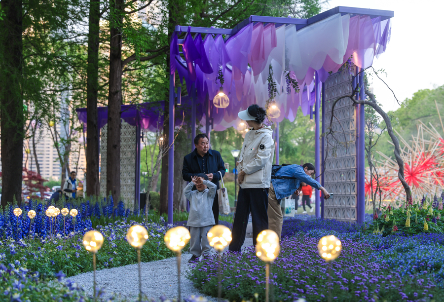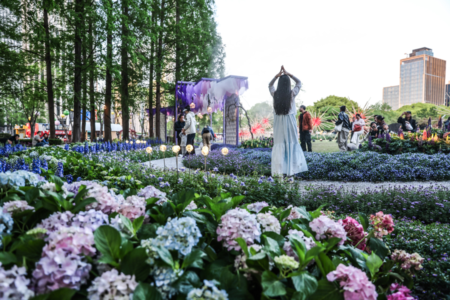 花卉节期间,豫园商城化身“古典花神的梦境花园”,十二花神降临明清建筑群中,用花语重塑东方美学;行至BFC“超现实主义的未来花园”,梦境与现实的边界在这里被打破。古城公园则被国内外顶尖艺术家重新定义为“城市记忆的生态花园”。入夜后,“林涧寻芳”光影点亮,人们在灯火与花影间,尽享赏灯观花的诗意时光。