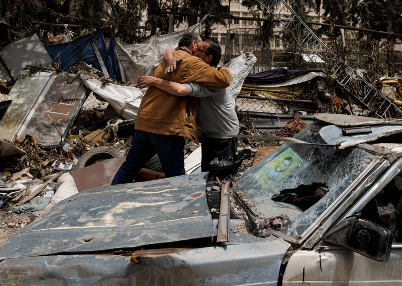 4月18日,在黎巴嫩奈拜提耶,重返家园的人们在一辆损毁的汽车旁拥抱。 新华社/路透