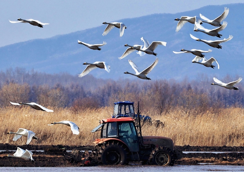 4月18日,在黑龙江省同江市的一处水田里,正在作业的农机和飞翔的天鹅相映成趣。 新华社发(刘万平摄)