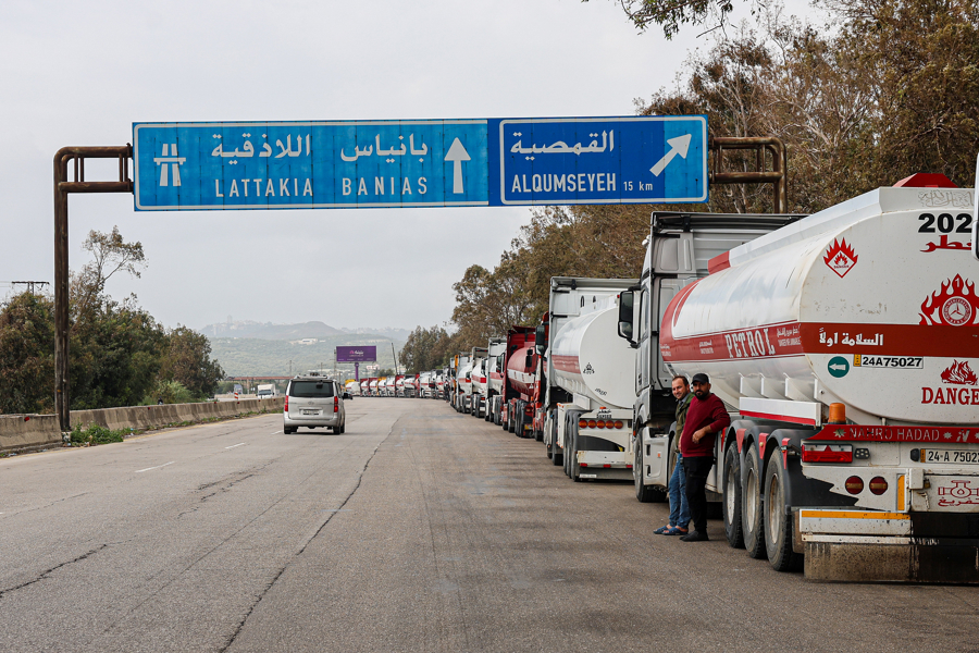 4月19日,叙利亚塔尔图斯,伊拉克油罐车沿高速公路排队,因霍尔木兹海峡关闭,伊拉克通过叙利亚出口石油。