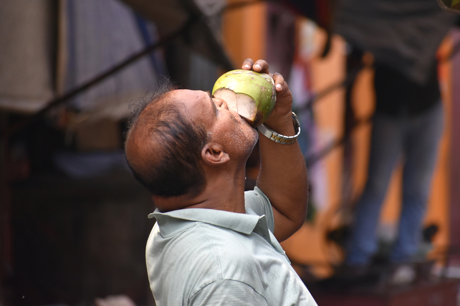 4月19日,一名民众在热浪中饮用椰子水解暑。
