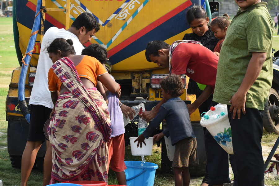 4月19日,人们在热浪期间从水罐车取水。